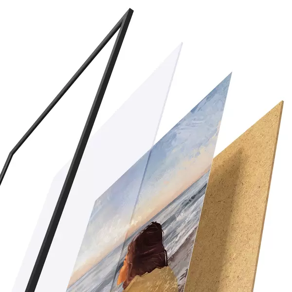 Plakatą sudaro rėmas, pleksiklas, atspausdintas vaizdas ir medžio drožlių plokštės pagrindas. Plakatą galima iš karto pakabinti ant sienos dėl kitoje pusėje esančių laikiklių.