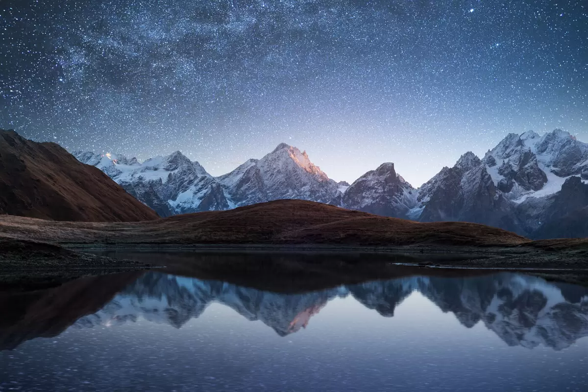 Plakatas Naktinis kraštovaizdis su kalnų ežeru ir žvaigždėtu dangumi f35372