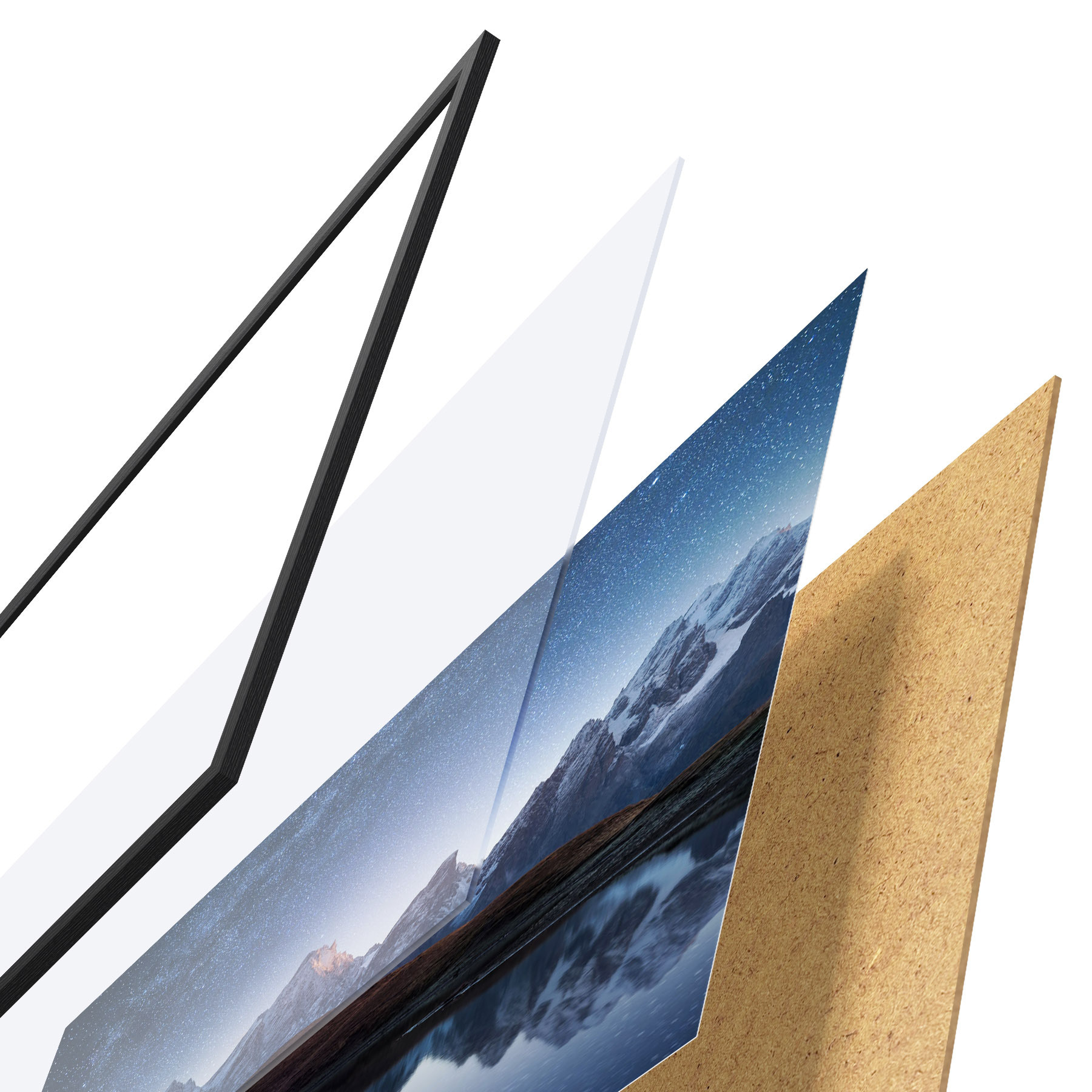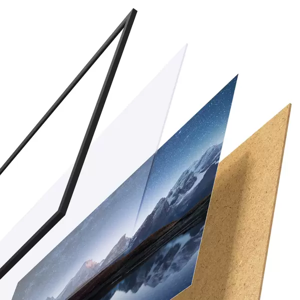 Plakatą sudaro rėmas, pleksiklas, atspausdintas vaizdas ir medžio drožlių plokštės pagrindas. Plakatą galima iš karto pakabinti ant sienos dėl kitoje pusėje esančių laikiklių.