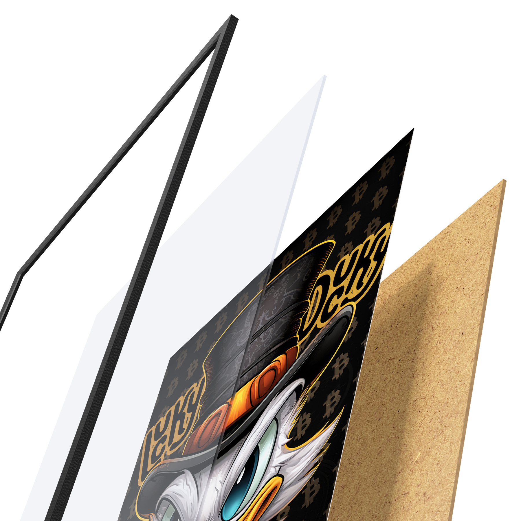 Plakatą sudaro rėmas, pleksiklas, atspausdintas vaizdas ir medžio drožlių plokštės pagrindas. Plakatą galima iš karto pakabinti ant sienos dėl kitoje pusėje esančių laikiklių.
