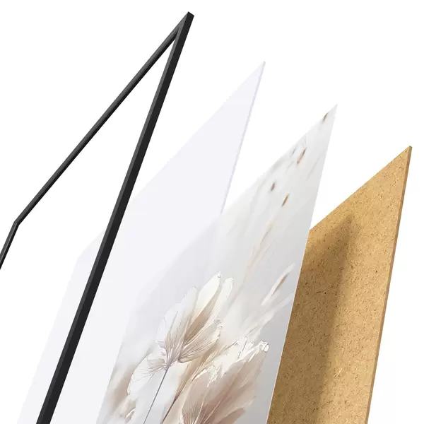 Plakatą sudaro rėmas, pleksiklas, atspausdintas vaizdas ir medžio drožlių plokštės pagrindas. Plakatą galima iš karto pakabinti ant sienos dėl kitoje pusėje esančių laikiklių.