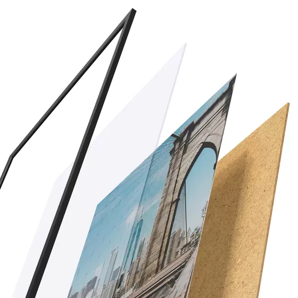 Plakatą sudaro rėmas, pleksiklas, atspausdintas vaizdas ir medžio drožlių plokštės pagrindas. Plakatą galima iš karto pakabinti ant sienos dėl kitoje pusėje esančių laikiklių.