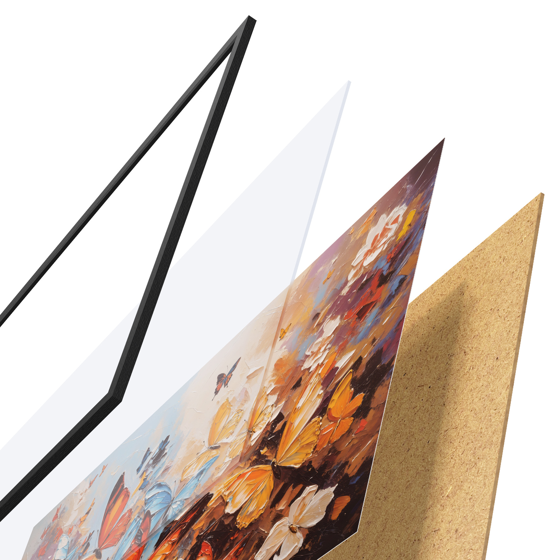 Plakatą sudaro rėmas, pleksiklas, atspausdintas vaizdas ir medžio drožlių plokštės pagrindas. Plakatą galima iš karto pakabinti ant sienos dėl kitoje pusėje esančių laikiklių.