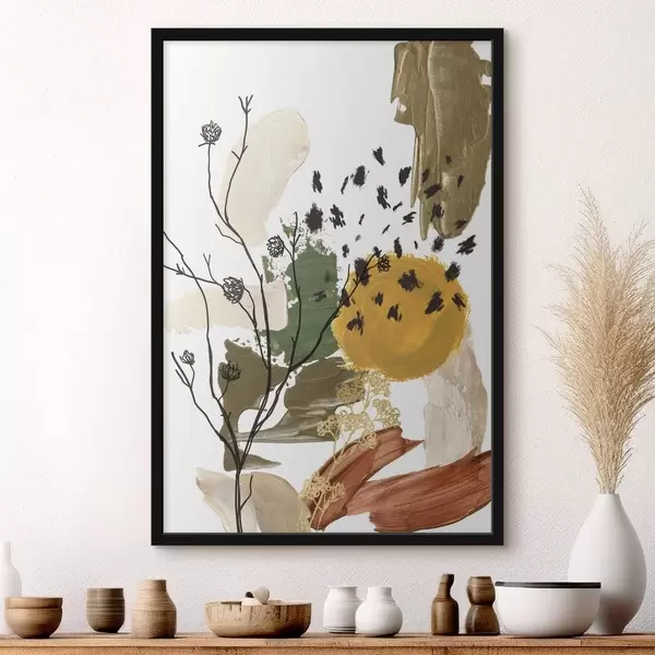 Plakatas Akvarelinė rudens kompozicija iš linijinių šakų, rudų, geltonų ir žalių dėmių. Ne f35950