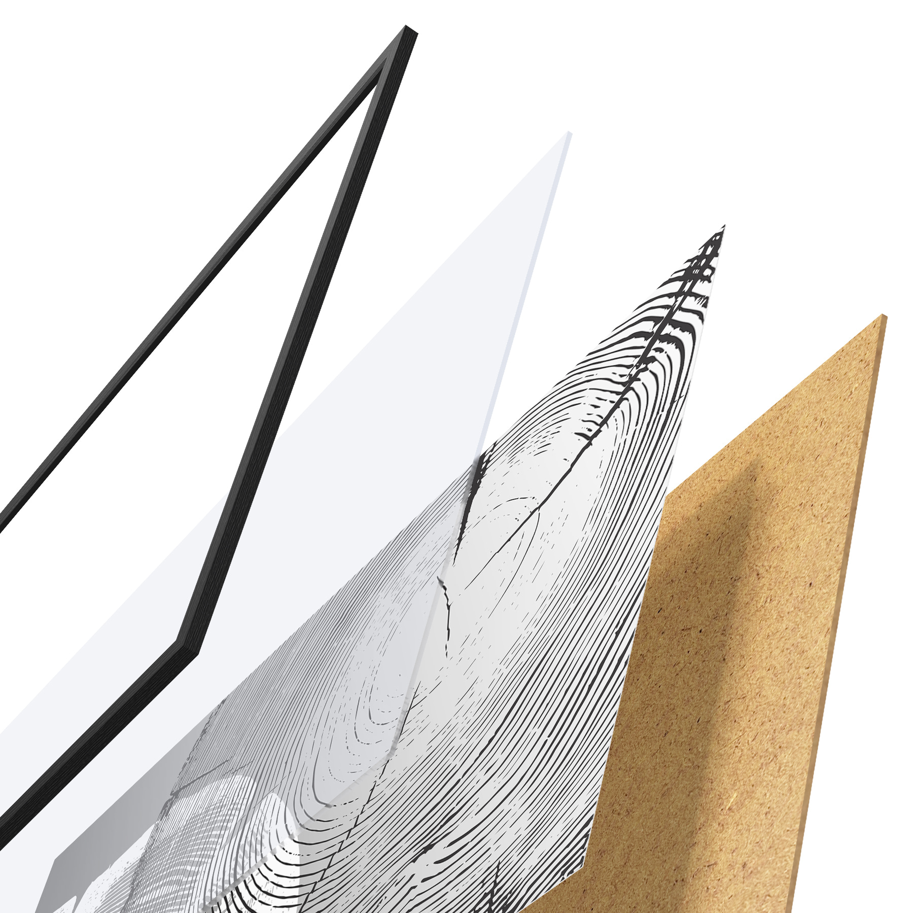 Plakatą sudaro rėmas, pleksiklas, atspausdintas vaizdas ir medžio drožlių plokštės pagrindas. Plakatą galima iš karto pakabinti ant sienos dėl kitoje pusėje esančių laikiklių.