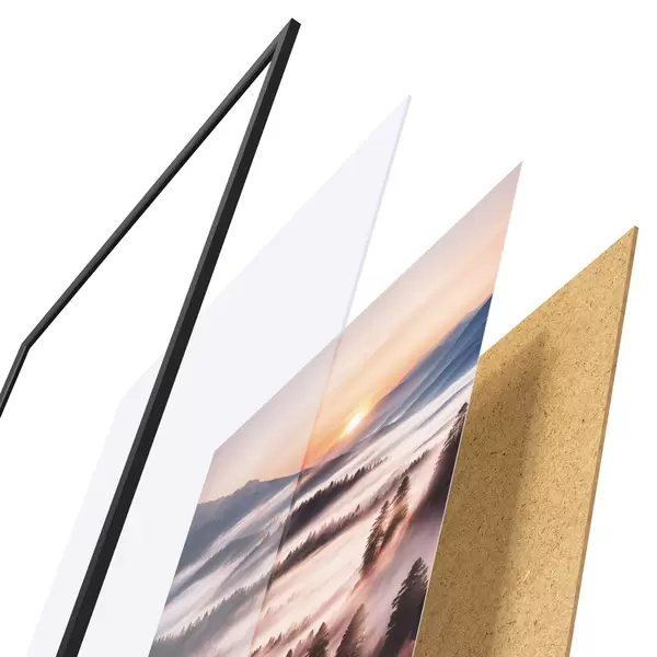 Plakatą sudaro rėmas, pleksiklas, atspausdintas vaizdas ir medžio drožlių plokštės pagrindas. Plakatą galima iš karto pakabinti ant sienos dėl kitoje pusėje esančių laikiklių.