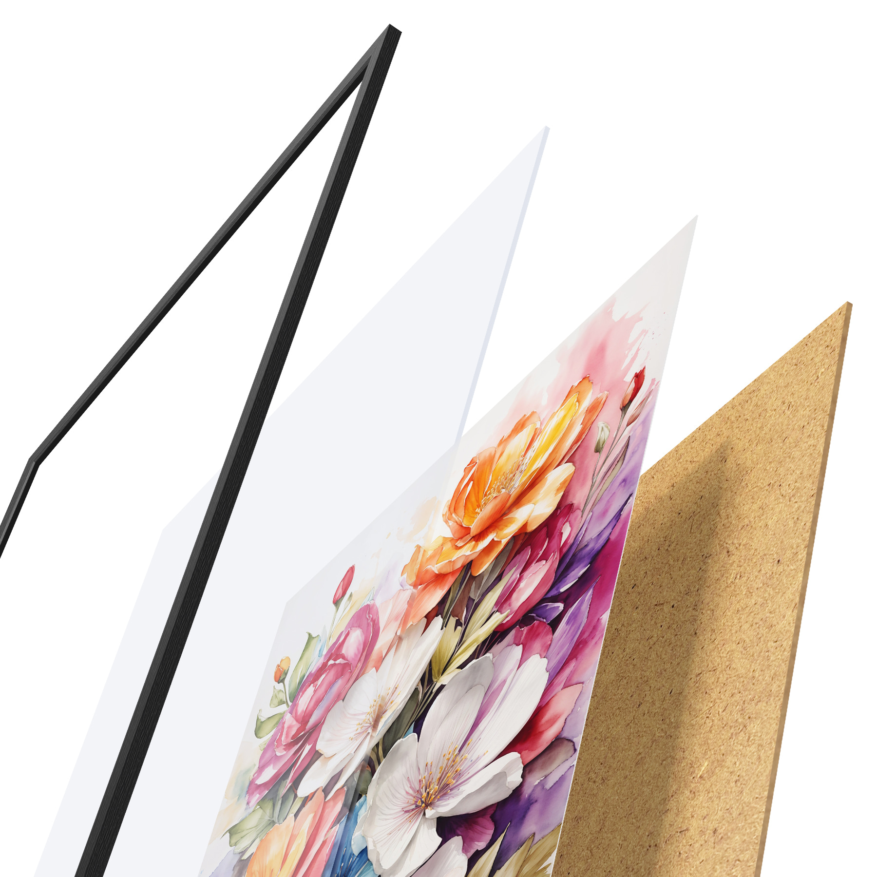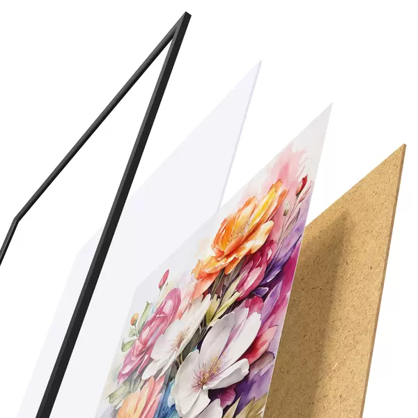 Plakatą sudaro rėmas, pleksiklas, atspausdintas vaizdas ir medžio drožlių plokštės pagrindas. Plakatą galima iš karto pakabinti ant sienos dėl kitoje pusėje esančių laikiklių.