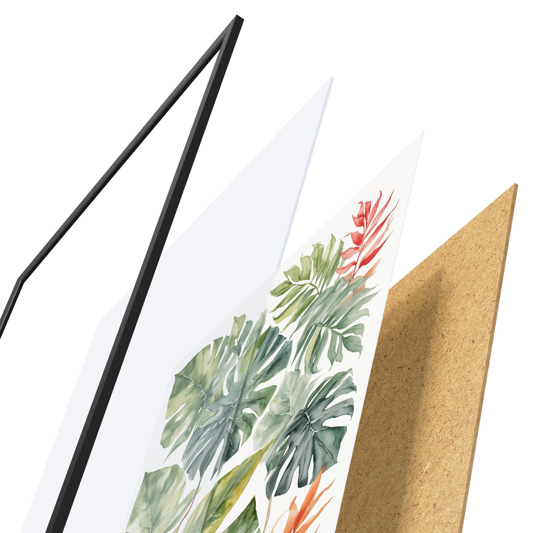 Plakatą sudaro rėmas, pleksiklas, atspausdintas vaizdas ir medžio drožlių plokštės pagrindas. Plakatą galima iš karto pakabinti ant sienos dėl kitoje pusėje esančių laikiklių.