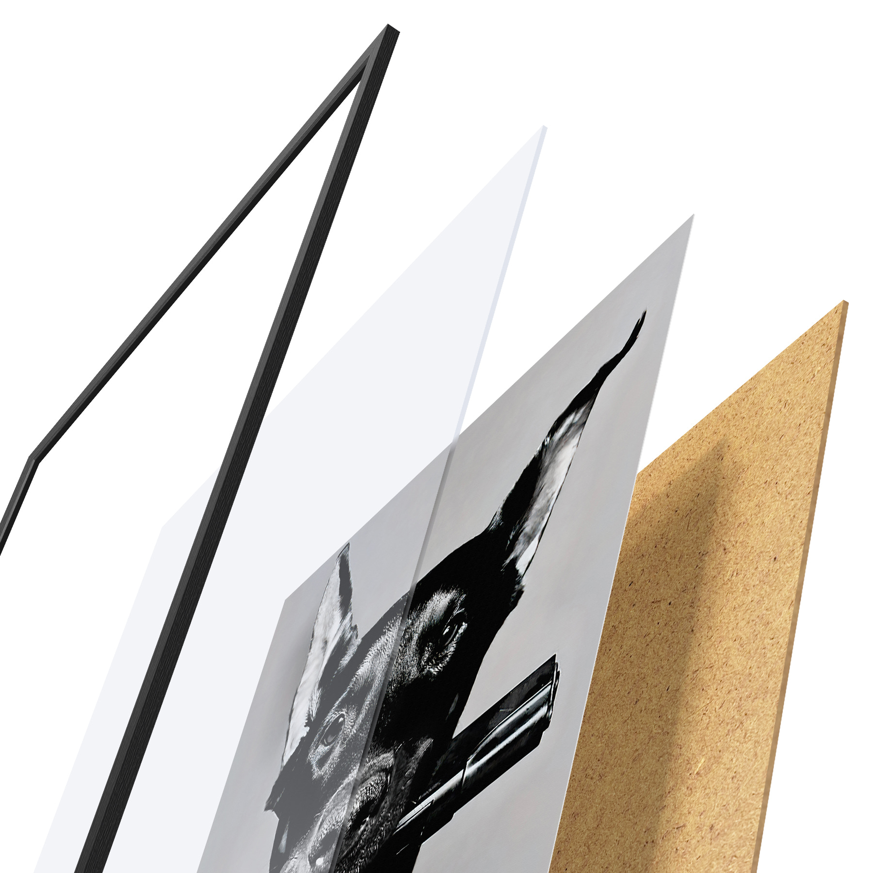 Plakatą sudaro rėmas, pleksiklas, atspausdintas vaizdas ir medžio drožlių plokštės pagrindas. Plakatą galima iš karto pakabinti ant sienos dėl kitoje pusėje esančių laikiklių.