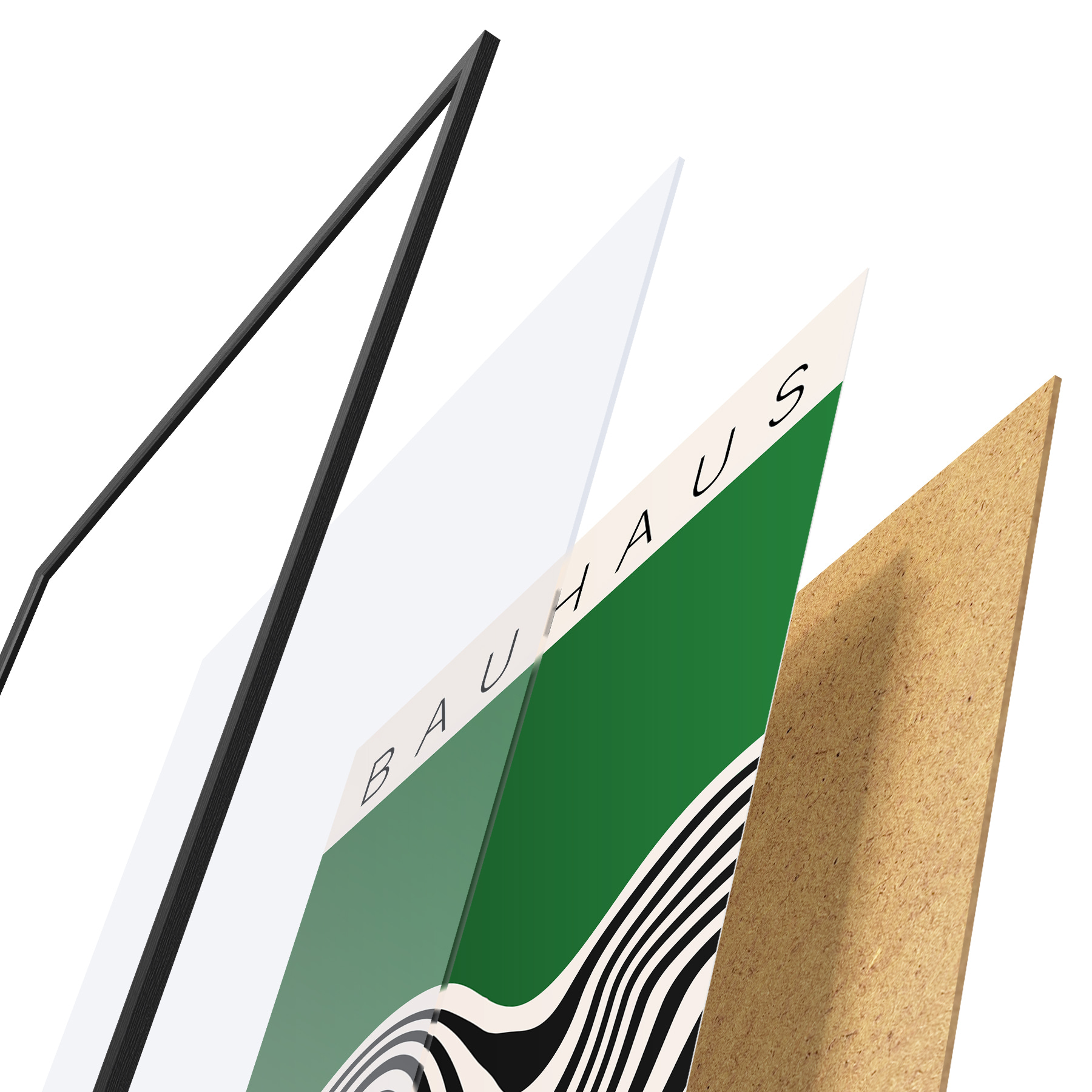 Plakatą sudaro rėmas, pleksiklas, atspausdintas vaizdas ir medžio drožlių plokštės pagrindas. Plakatą galima iš karto pakabinti ant sienos dėl kitoje pusėje esančių laikiklių.