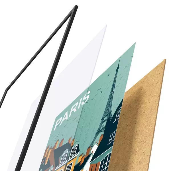 Plakatą sudaro rėmas, pleksiklas, atspausdintas vaizdas ir medžio drožlių plokštės pagrindas. Plakatą galima iš karto pakabinti ant sienos dėl kitoje pusėje esančių laikiklių.