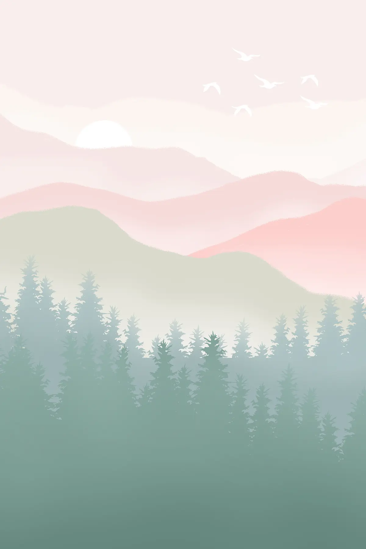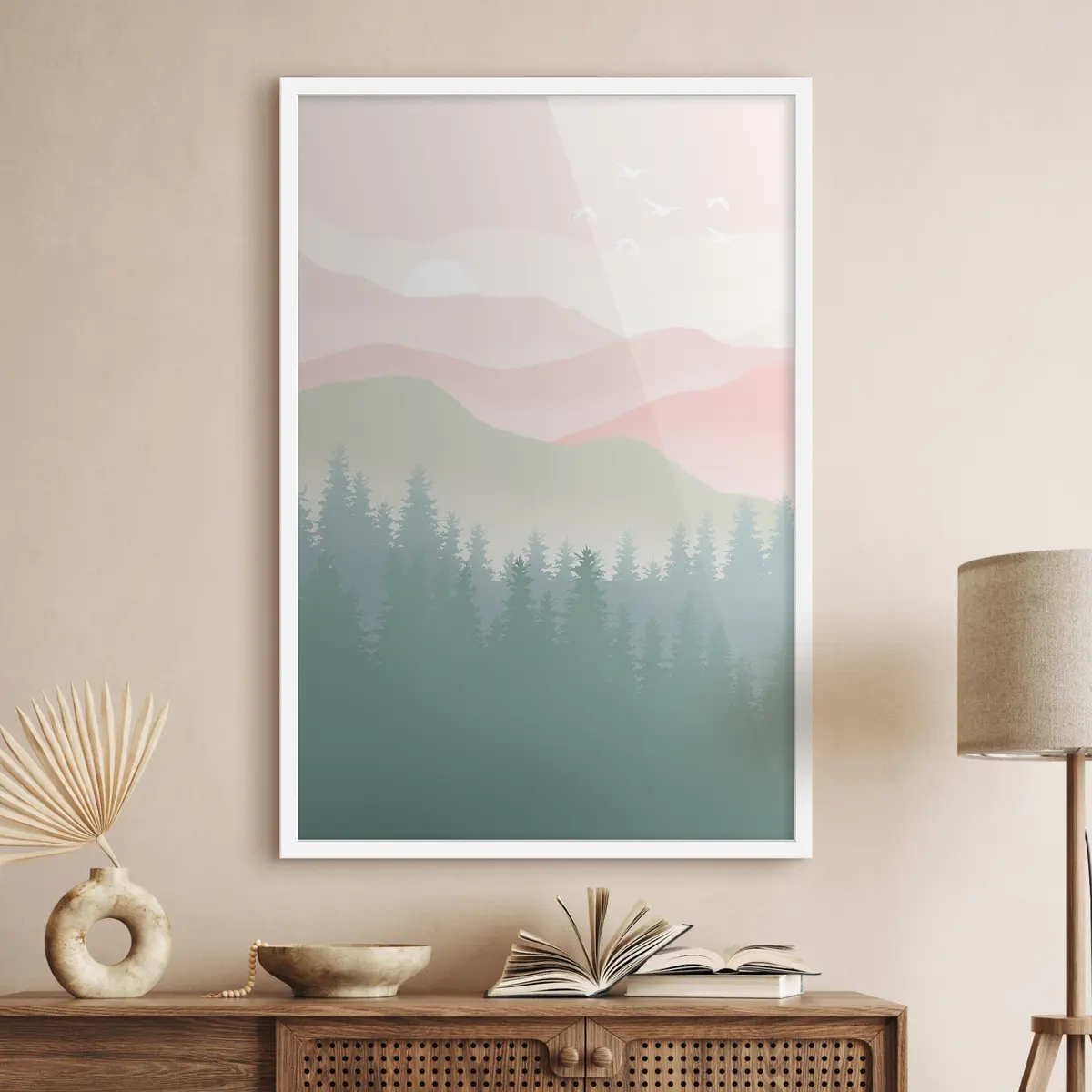 Plakatas Ramus kraštovaizdis saulėtekio metu su paukščiais f36394