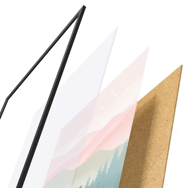 Plakatą sudaro rėmas, pleksiklas, atspausdintas vaizdas ir medžio drožlių plokštės pagrindas. Plakatą galima iš karto pakabinti ant sienos dėl kitoje pusėje esančių laikiklių.