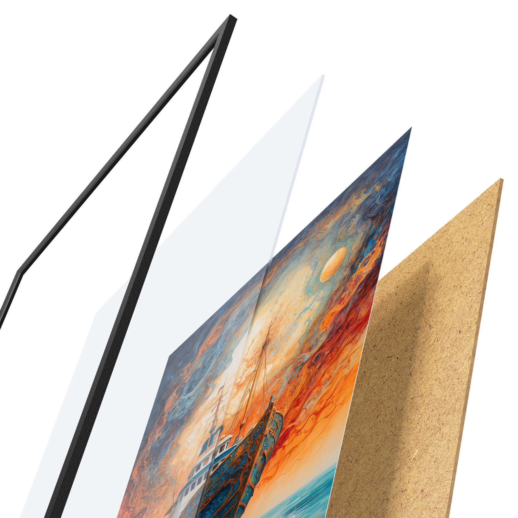 Plakatą sudaro rėmas, pleksiklas, atspausdintas vaizdas ir medžio drožlių plokštės pagrindas. Plakatą galima iš karto pakabinti ant sienos dėl kitoje pusėje esančių laikiklių.
