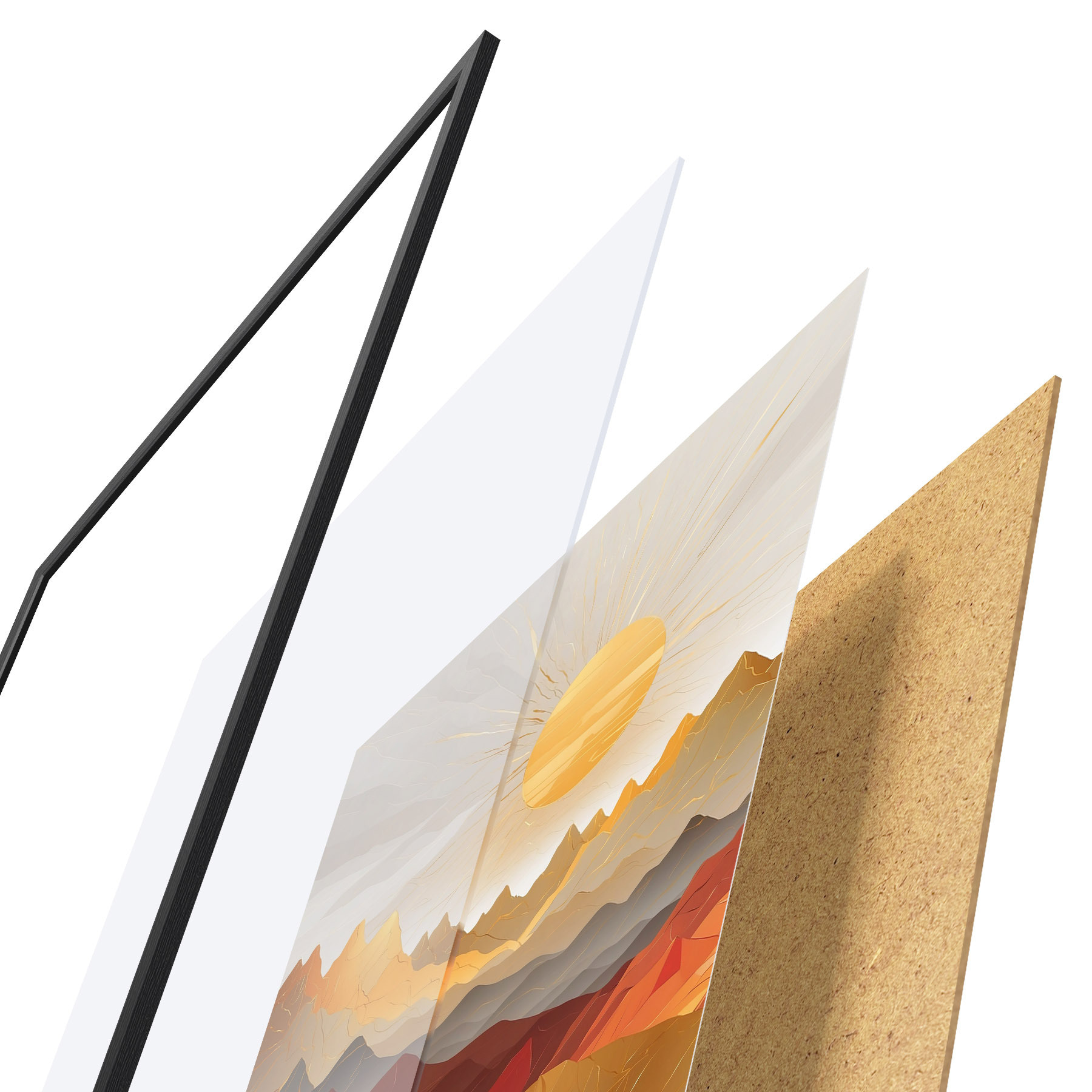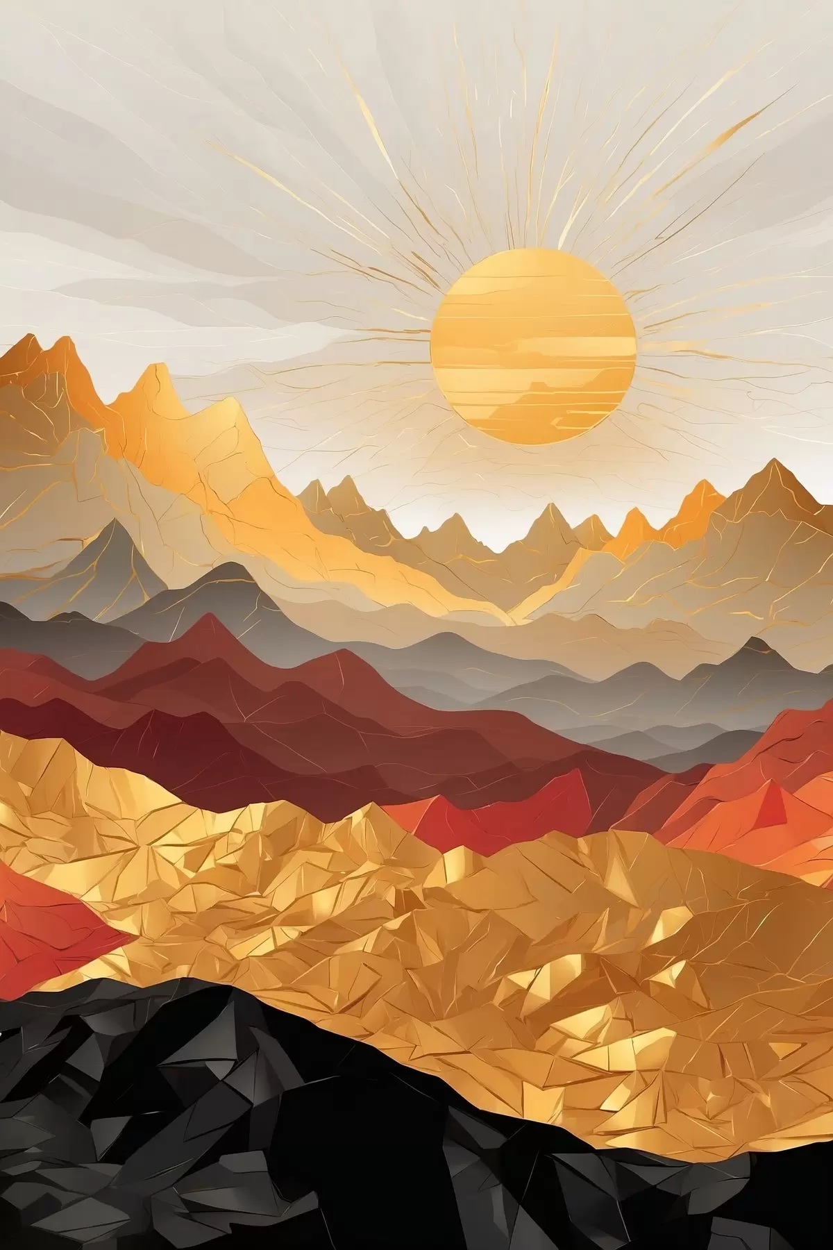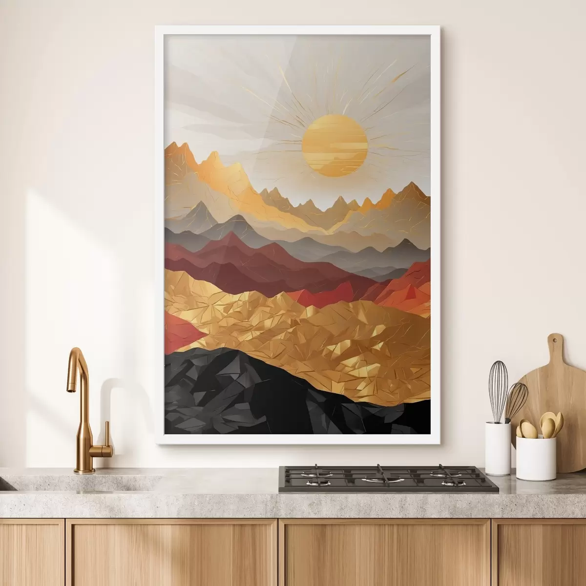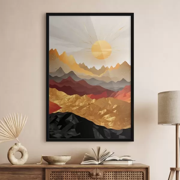 Plakatas Saulėtekis virš geometrinio kalnų kraštovaizdžio f36529