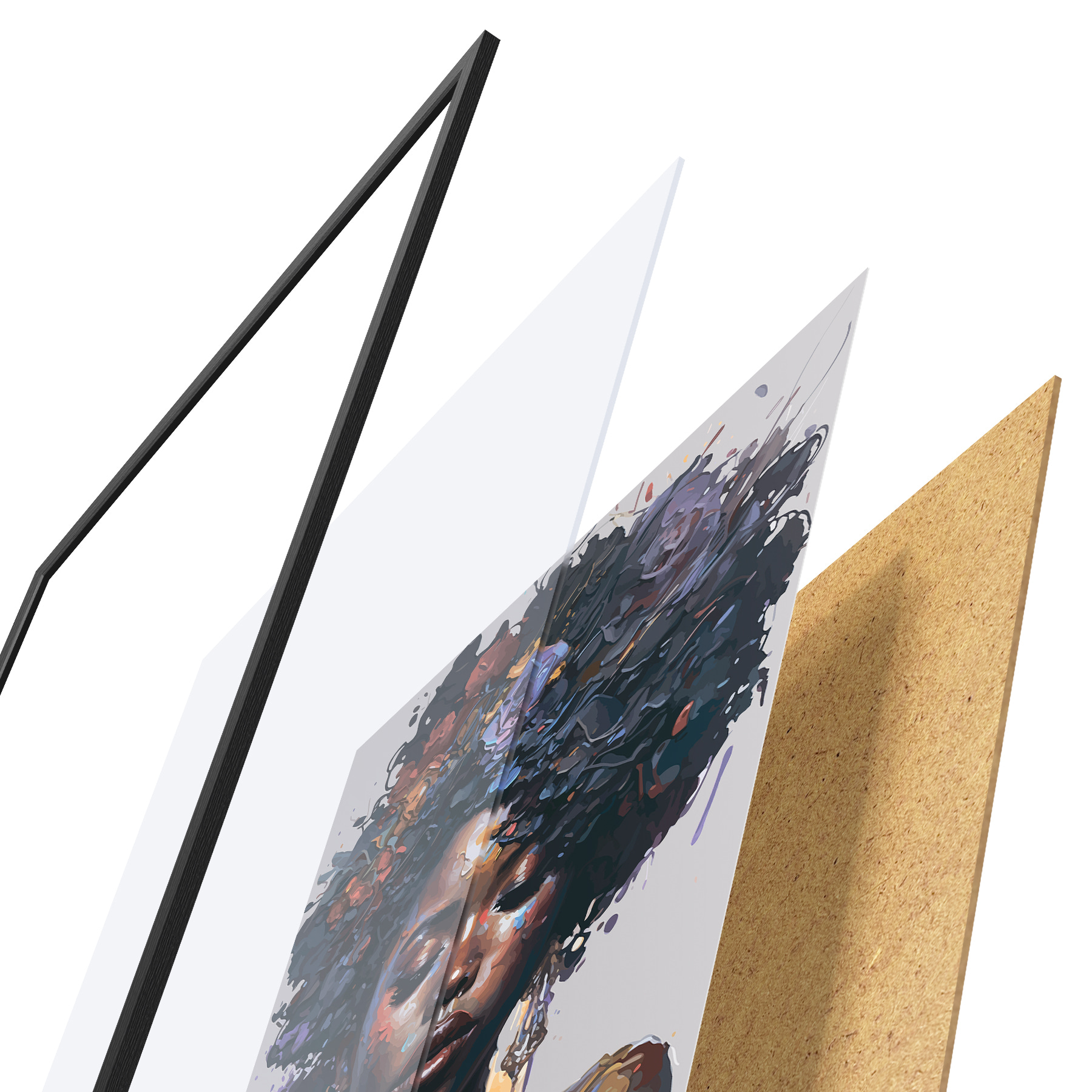 Plakatą sudaro rėmas, pleksiklas, atspausdintas vaizdas ir medžio drožlių plokštės pagrindas. Plakatą galima iš karto pakabinti ant sienos dėl kitoje pusėje esančių laikiklių.