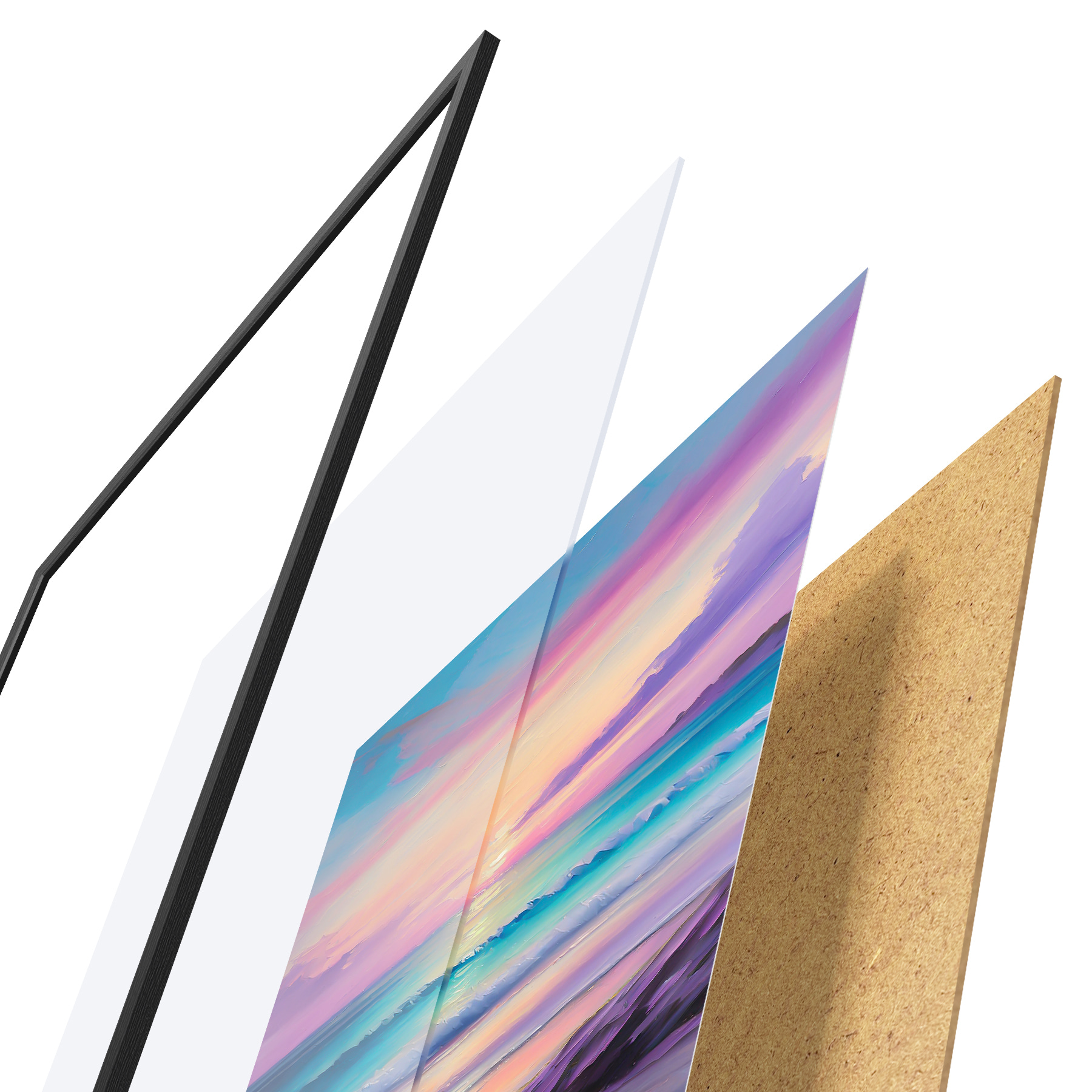 Plakatą sudaro rėmas, pleksiklas, atspausdintas vaizdas ir medžio drožlių plokštės pagrindas. Plakatą galima iš karto pakabinti ant sienos dėl kitoje pusėje esančių laikiklių.