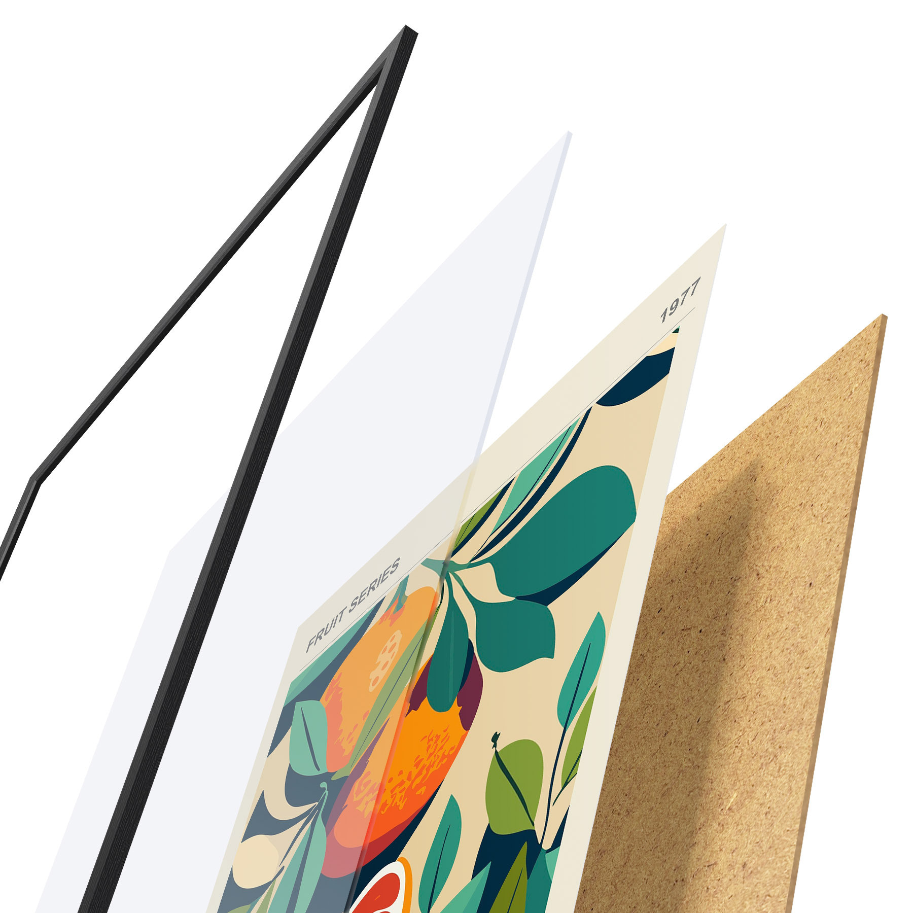 Plakatą sudaro rėmas, pleksiklas, atspausdintas vaizdas ir medžio drožlių plokštės pagrindas. Plakatą galima iš karto pakabinti ant sienos dėl kitoje pusėje esančių laikiklių.