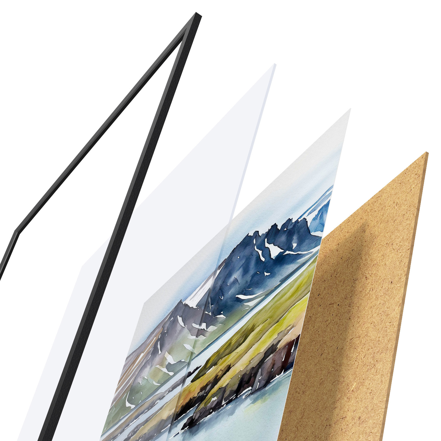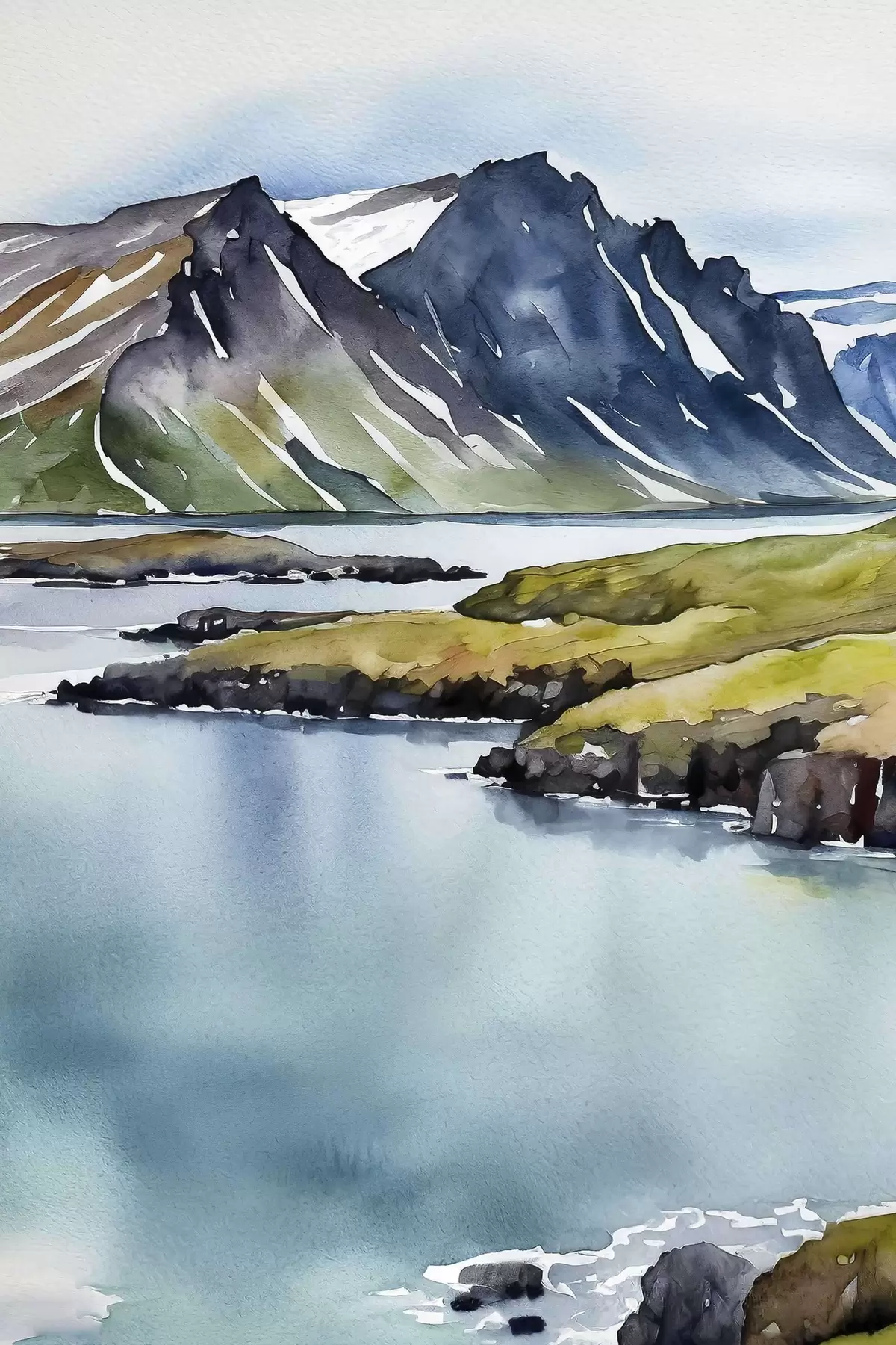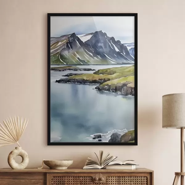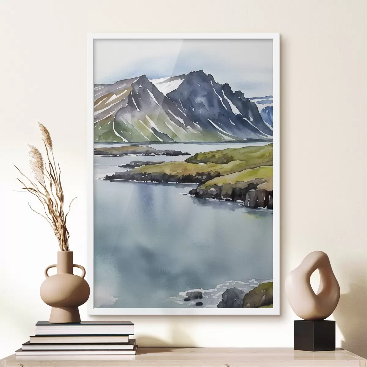 Plakatas Akvarelė, vaizduojanti ežerą ir kalnus f36679