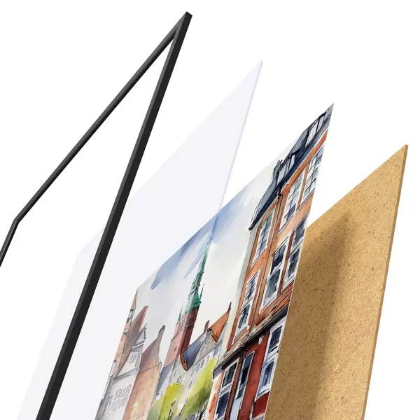 Plakatą sudaro rėmas, pleksiklas, atspausdintas vaizdas ir medžio drožlių plokštės pagrindas. Plakatą galima iš karto pakabinti ant sienos dėl kitoje pusėje esančių laikiklių.
