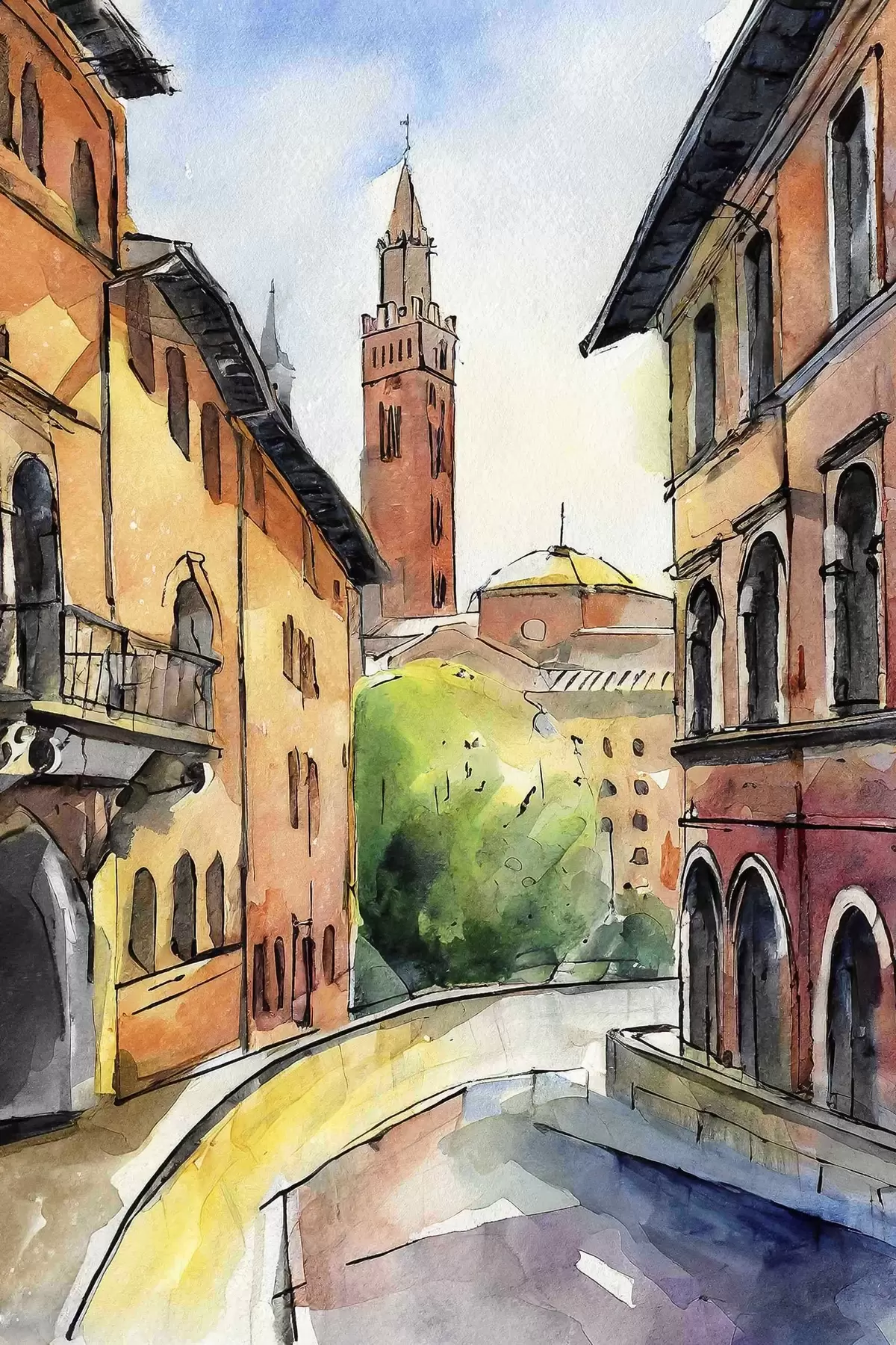 Plakatas Akvarele nutapytas gatvės su pastatais ir medžiais paveikslas f36684