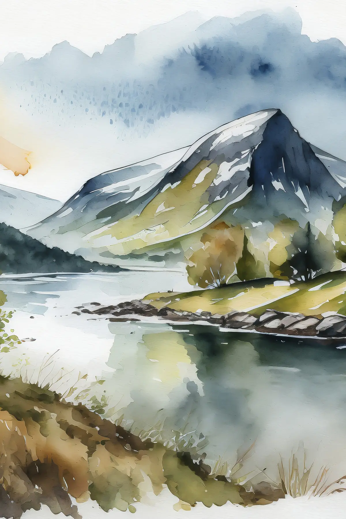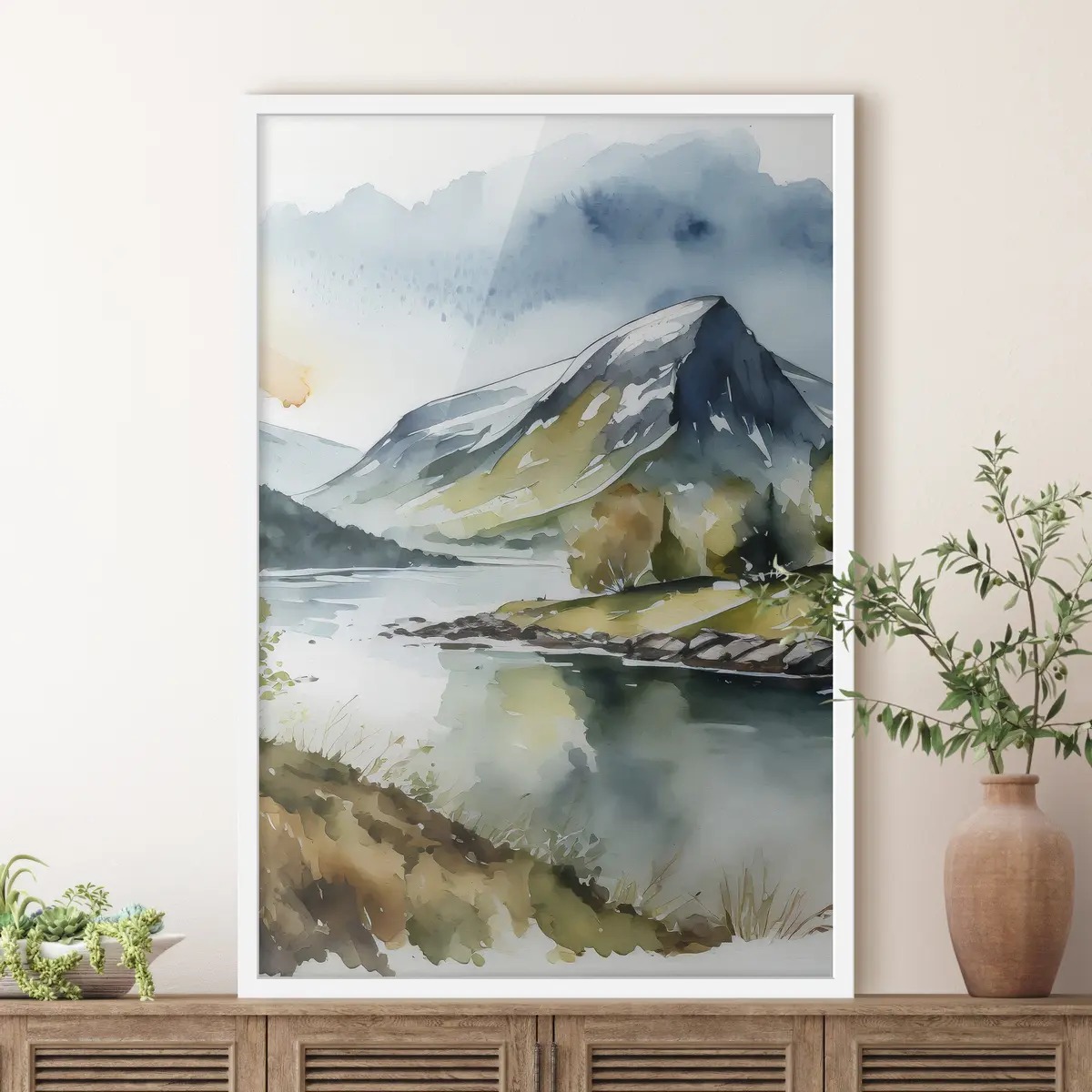 Plakatas Didingi kalnai atsispindi ramiame vandenyje f36686