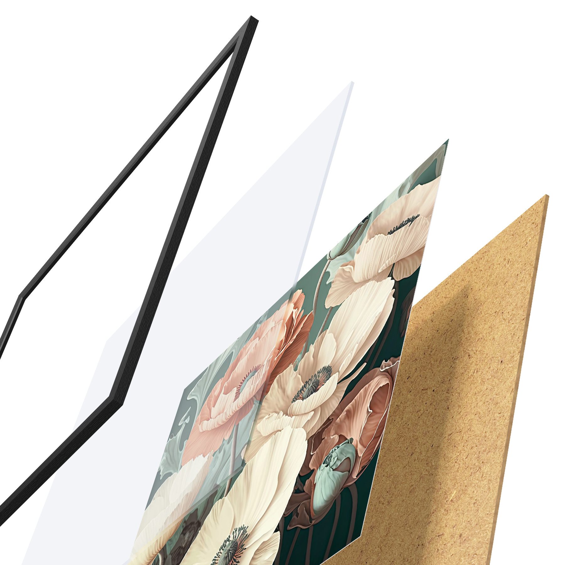 Plakatą sudaro rėmas, pleksiklas, atspausdintas vaizdas ir medžio drožlių plokštės pagrindas. Plakatą galima iš karto pakabinti ant sienos dėl kitoje pusėje esančių laikiklių.