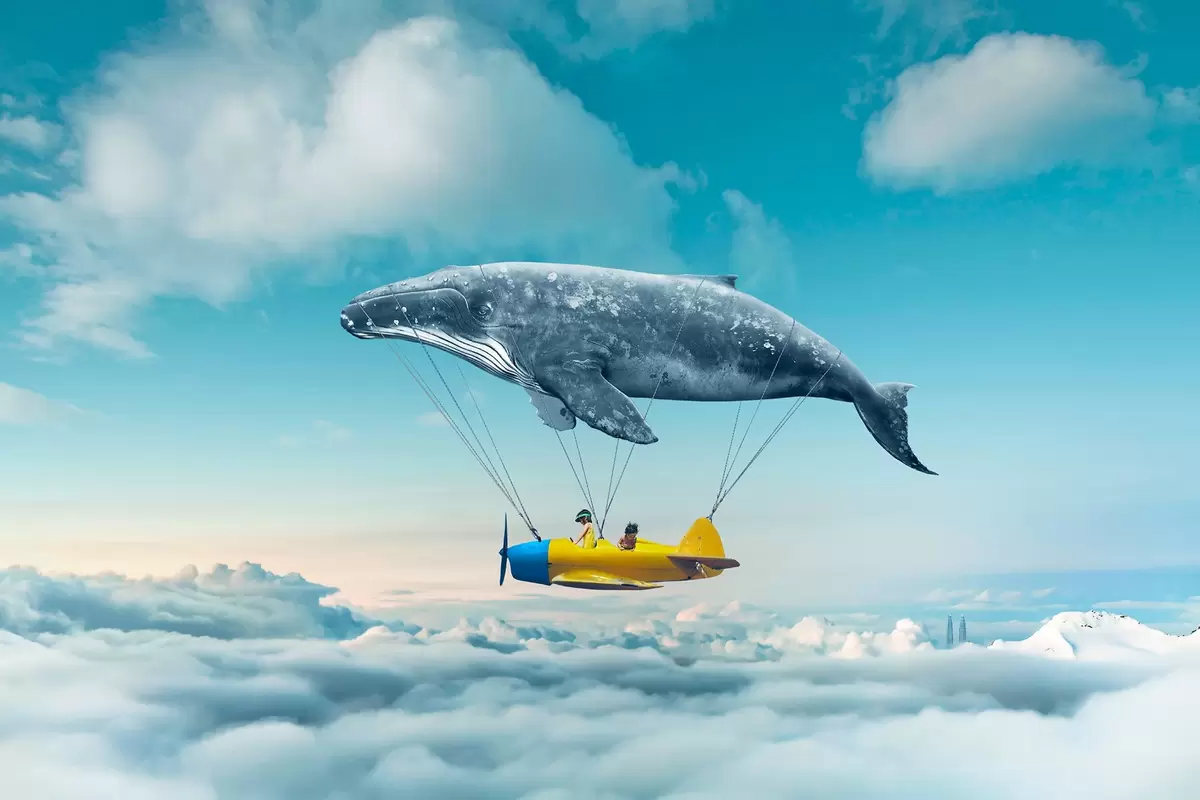 Plakatas Banginis ir banginis, pritvirtinti prie mažo lėktuvo f36701