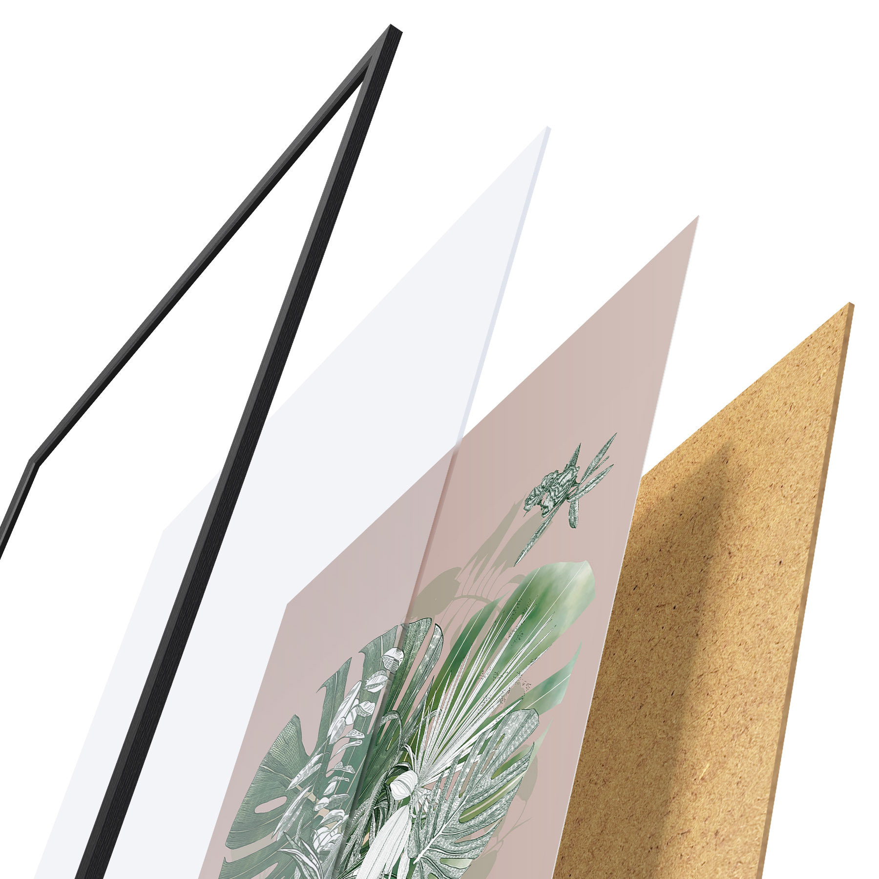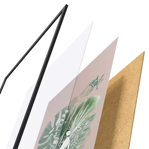 Plakatą sudaro rėmas, pleksiklas, atspausdintas vaizdas ir medžio drožlių plokštės pagrindas. Plakatą galima iš karto pakabinti ant sienos dėl kitoje pusėje esančių laikiklių.