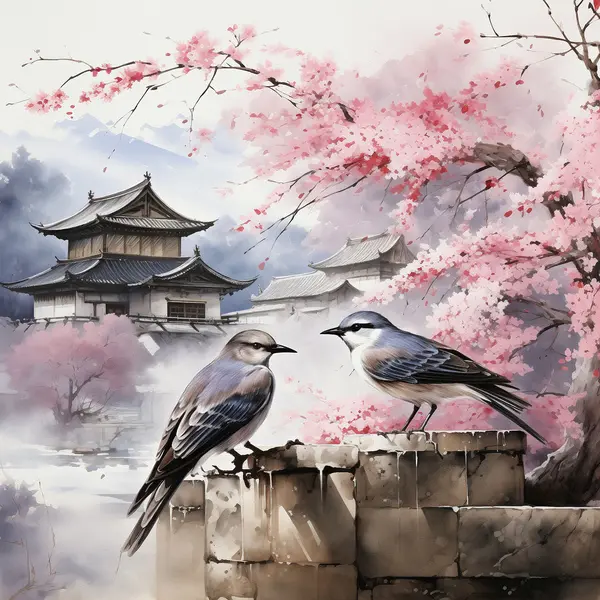 Plakatas Du paukščiai prie sakurų žiedų Ne f36815