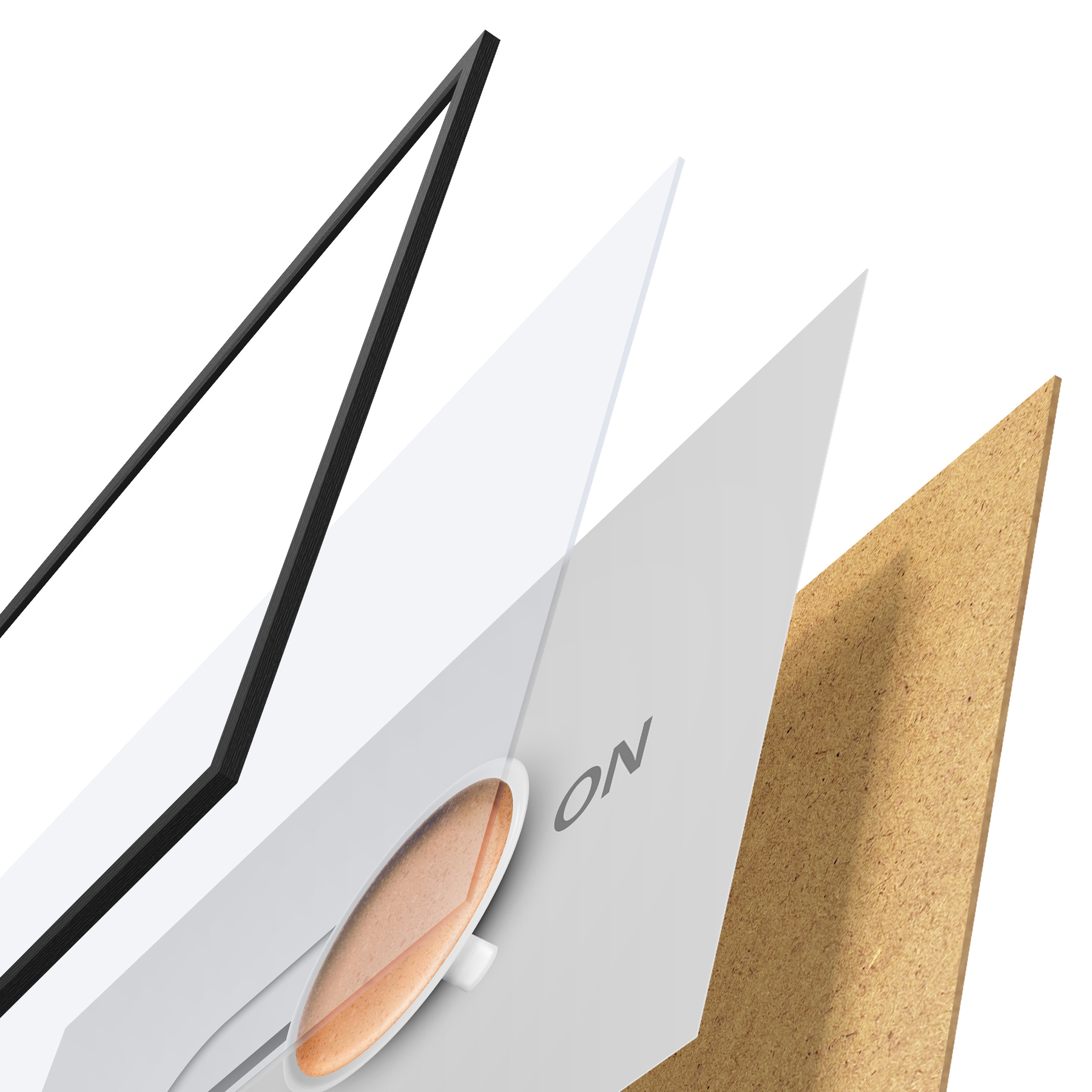 Plakatą sudaro rėmas, pleksiklas, atspausdintas vaizdas ir medžio drožlių plokštės pagrindas. Plakatą galima iš karto pakabinti ant sienos dėl kitoje pusėje esančių laikiklių.