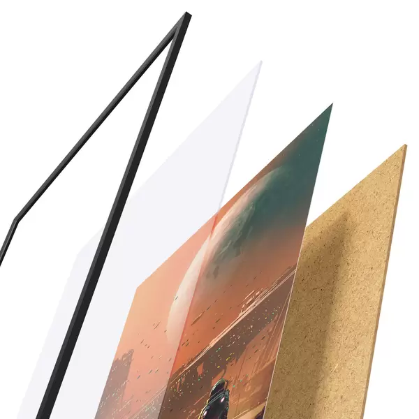 Plakatą sudaro rėmas, pleksiklas, atspausdintas vaizdas ir medžio drožlių plokštės pagrindas. Plakatą galima iš karto pakabinti ant sienos dėl kitoje pusėje esančių laikiklių.