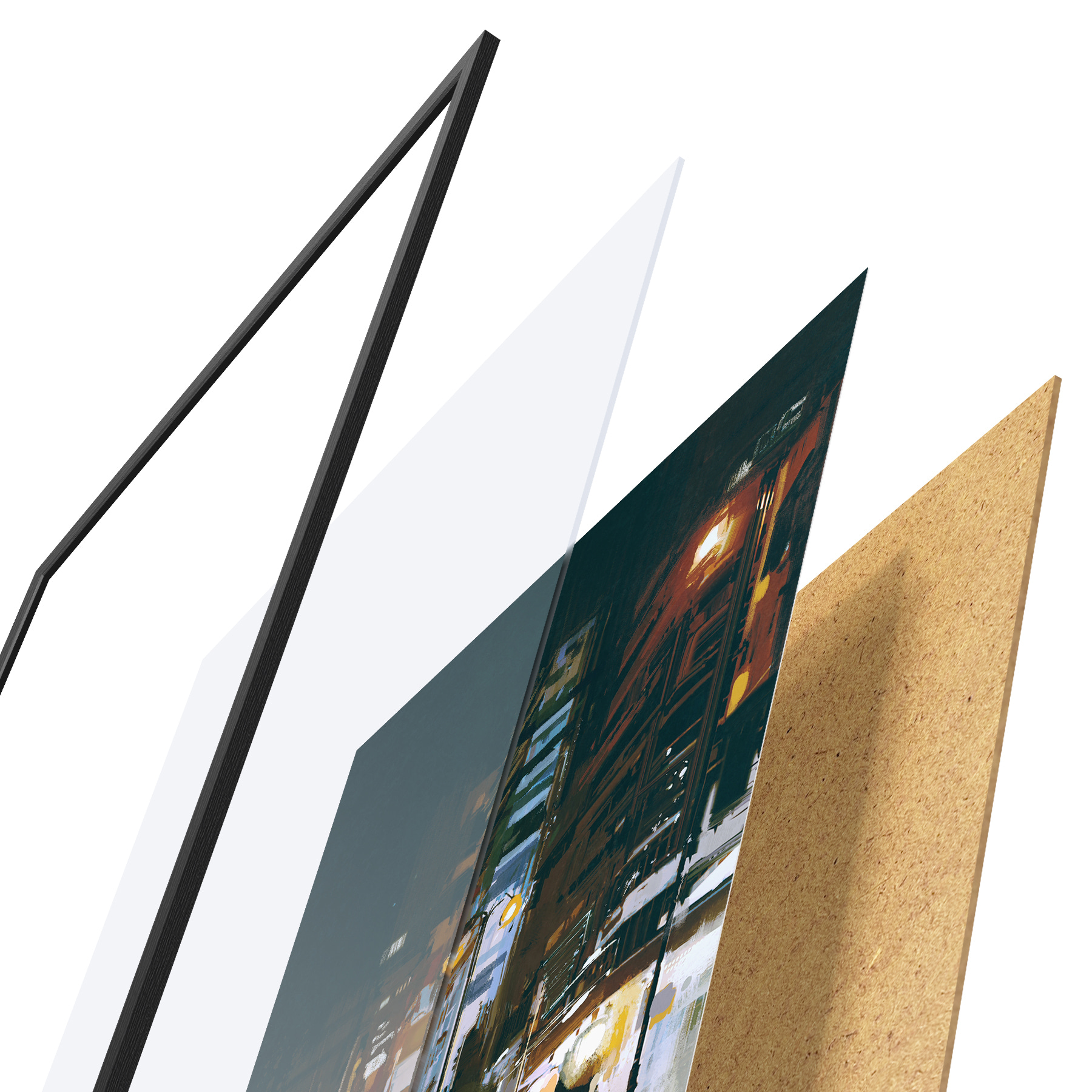 Plakatą sudaro rėmas, pleksiklas, atspausdintas vaizdas ir medžio drožlių plokštės pagrindas. Plakatą galima iš karto pakabinti ant sienos dėl kitoje pusėje esančių laikiklių.