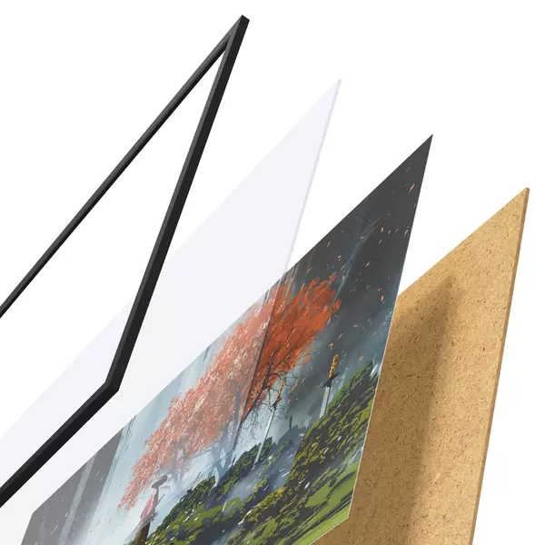 Plakatą sudaro rėmas, pleksiklas, atspausdintas vaizdas ir medžio drožlių plokštės pagrindas. Plakatą galima iš karto pakabinti ant sienos dėl kitoje pusėje esančių laikiklių.
