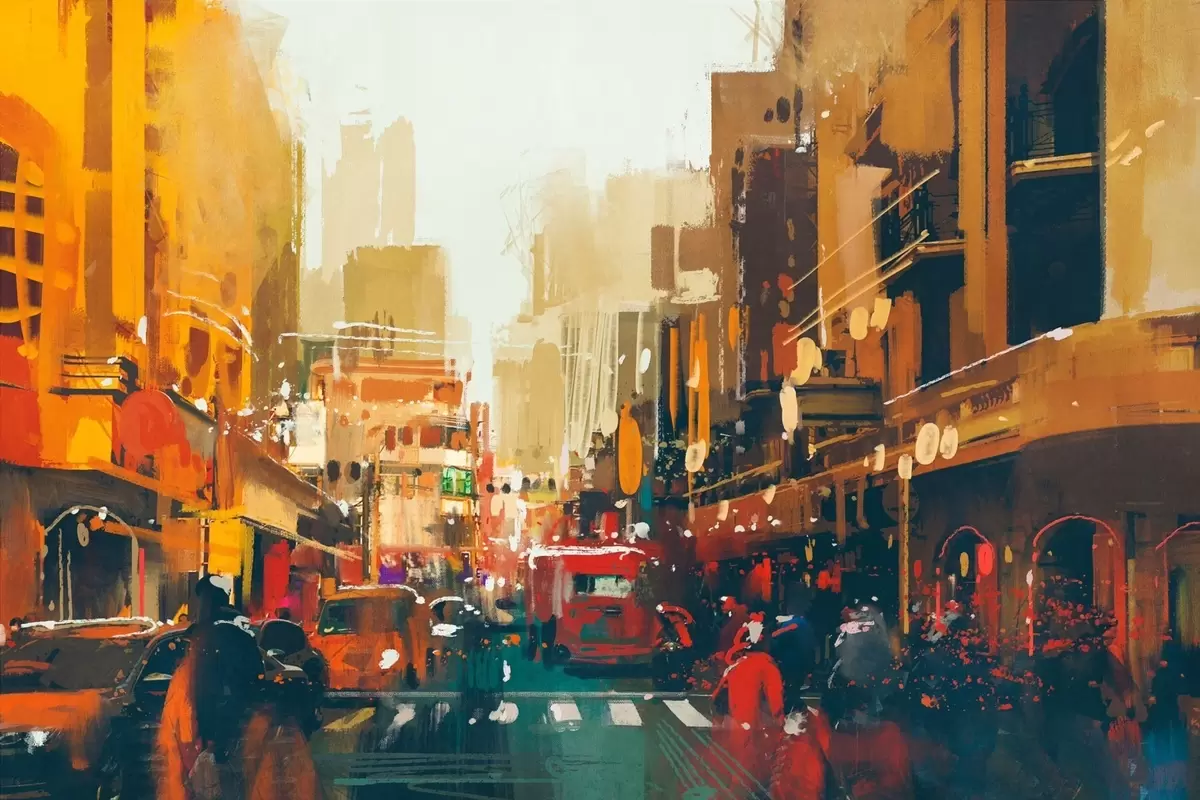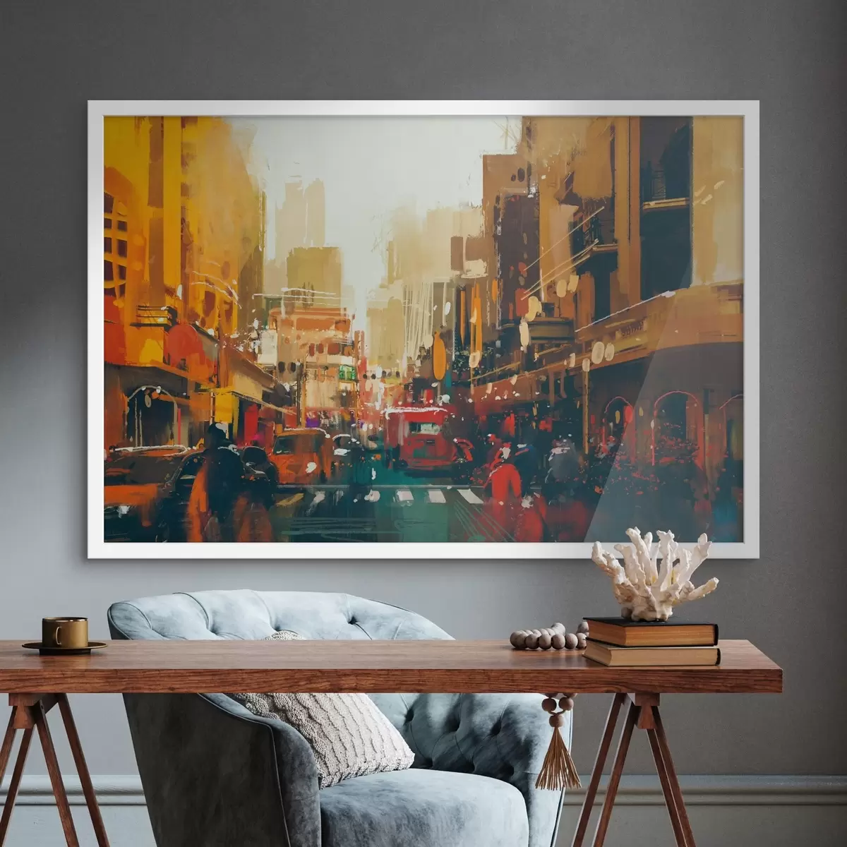 Plakatas Miesto gatvė su praeinančiais žmonėmis f37107