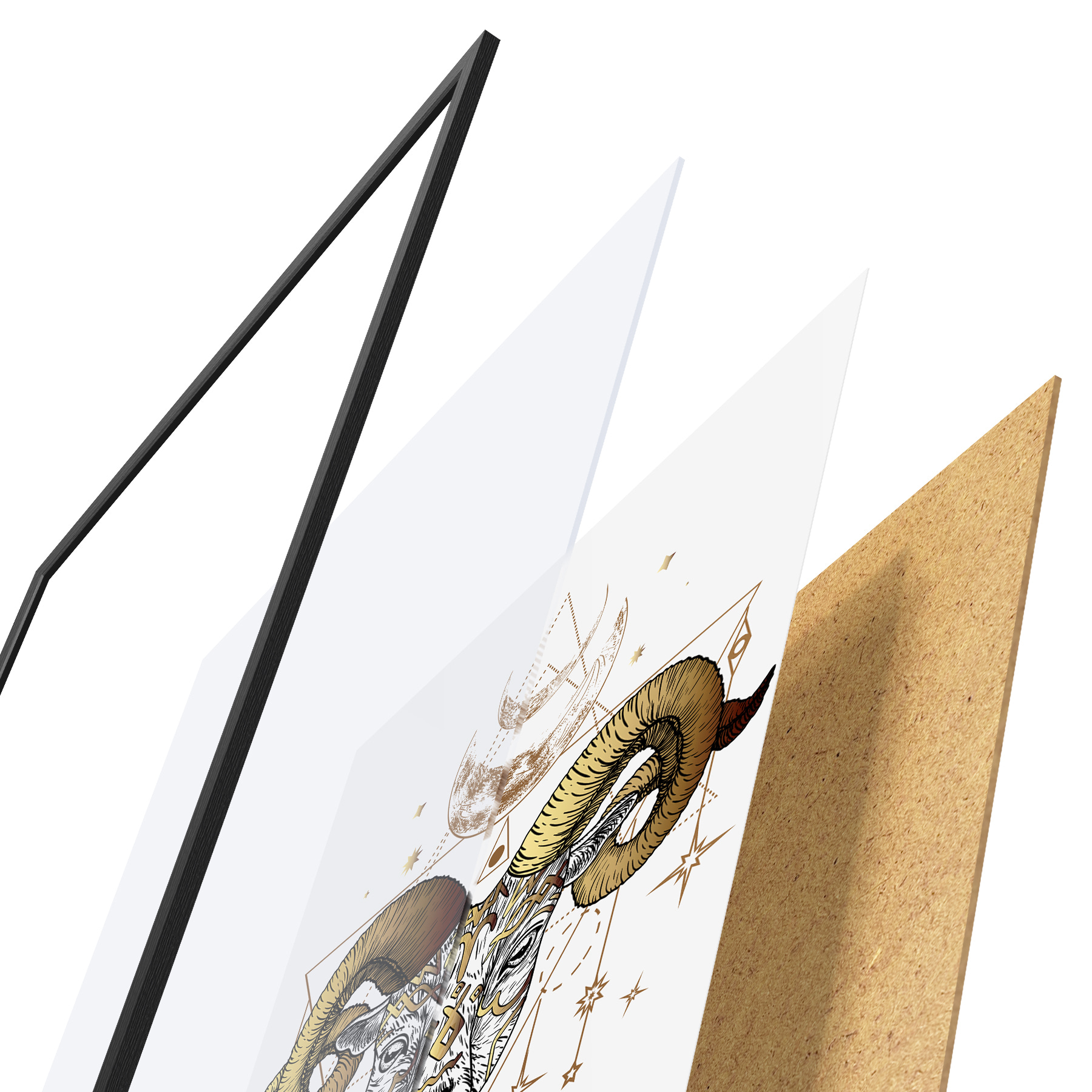 Plakatą sudaro rėmas, pleksiklas, atspausdintas vaizdas ir medžio drožlių plokštės pagrindas. Plakatą galima iš karto pakabinti ant sienos dėl kitoje pusėje esančių laikiklių.