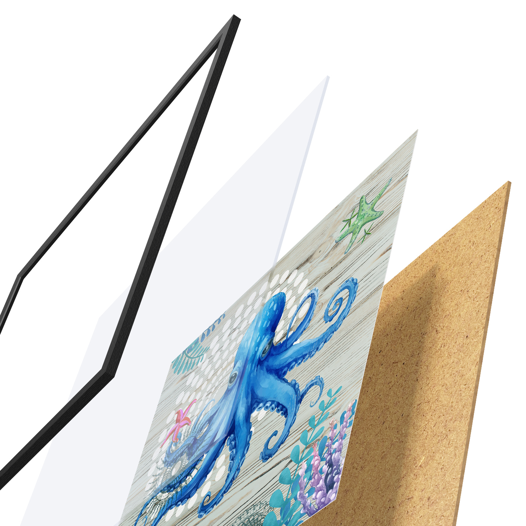 Plakatą sudaro rėmas, pleksiklas, atspausdintas vaizdas ir medžio drožlių plokštės pagrindas. Plakatą galima iš karto pakabinti ant sienos dėl kitoje pusėje esančių laikiklių.