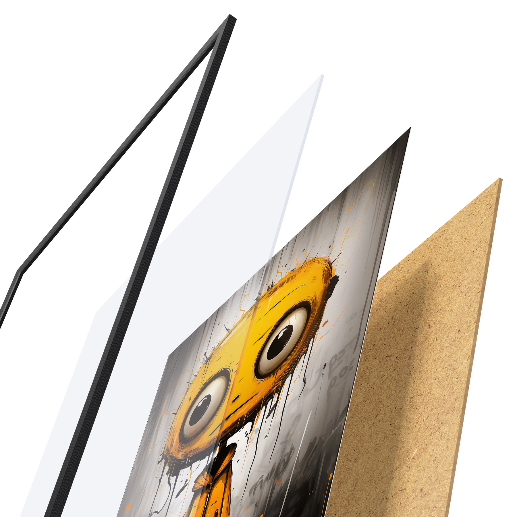 Plakatą sudaro rėmas, pleksiklas, atspausdintas vaizdas ir medžio drožlių plokštės pagrindas. Plakatą galima iš karto pakabinti ant sienos dėl kitoje pusėje esančių laikiklių.