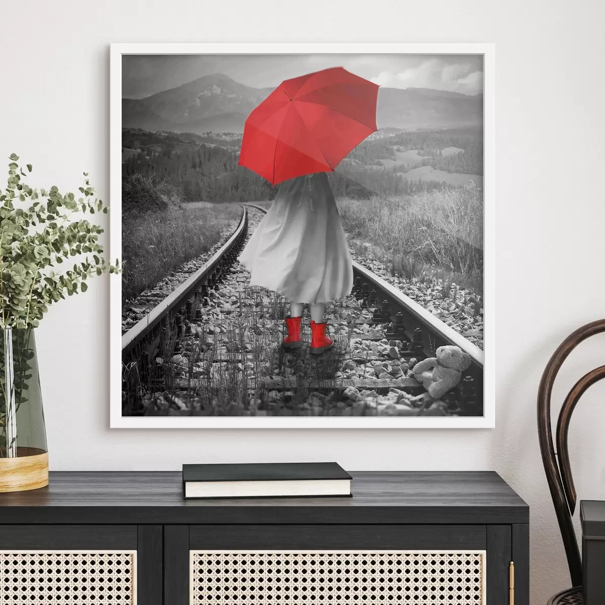 Plakatas Asmuo su raudonu skėčiu ant traukinio bėgių f37301
