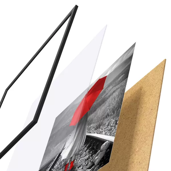 Plakatą sudaro rėmas, pleksiklas, atspausdintas vaizdas ir medžio drožlių plokštės pagrindas. Plakatą galima iš karto pakabinti ant sienos dėl kitoje pusėje esančių laikiklių.