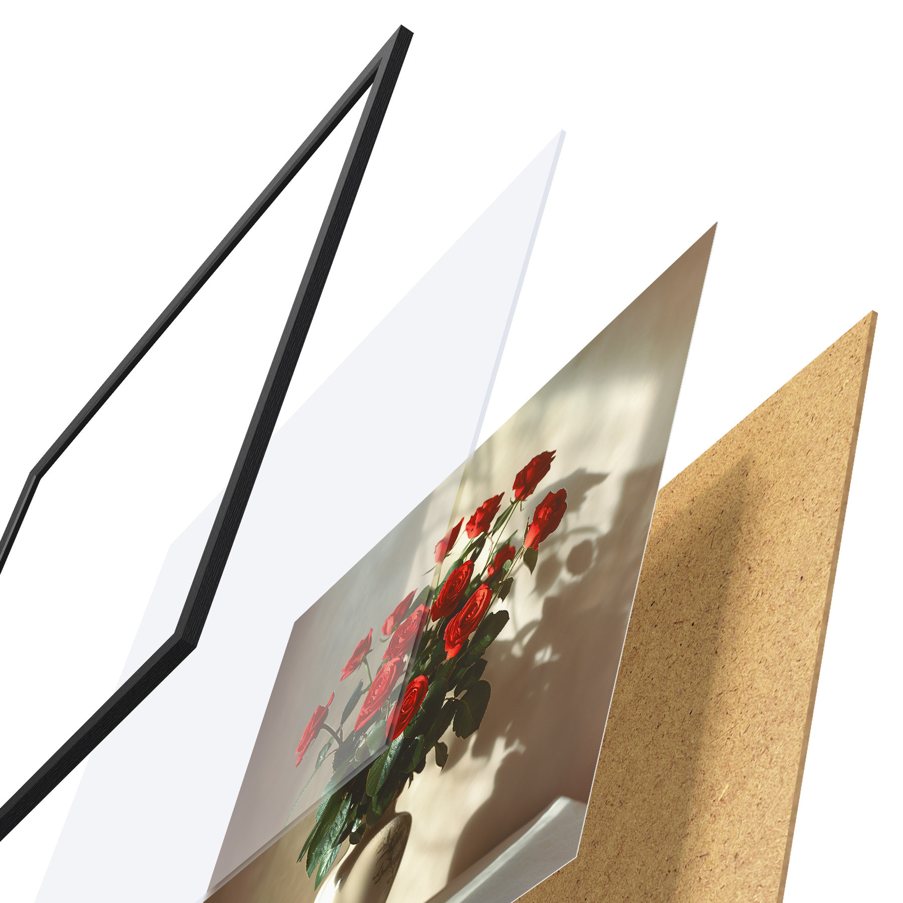 Plakatą sudaro rėmas, pleksiklas, atspausdintas vaizdas ir medžio drožlių plokštės pagrindas. Plakatą galima iš karto pakabinti ant sienos dėl kitoje pusėje esančių laikiklių.