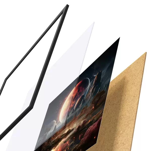 Plakatą sudaro rėmas, pleksiklas, atspausdintas vaizdas ir medžio drožlių plokštės pagrindas. Plakatą galima iš karto pakabinti ant sienos dėl kitoje pusėje esančių laikiklių.