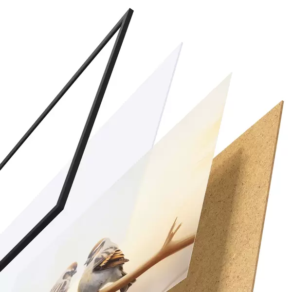 Plakatą sudaro rėmas, pleksiklas, atspausdintas vaizdas ir medžio drožlių plokštės pagrindas. Plakatą galima iš karto pakabinti ant sienos dėl kitoje pusėje esančių laikiklių.