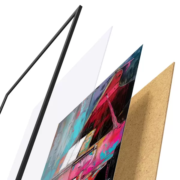 Plakatą sudaro rėmas, pleksiklas, atspausdintas vaizdas ir medžio drožlių plokštės pagrindas. Plakatą galima iš karto pakabinti ant sienos dėl kitoje pusėje esančių laikiklių.