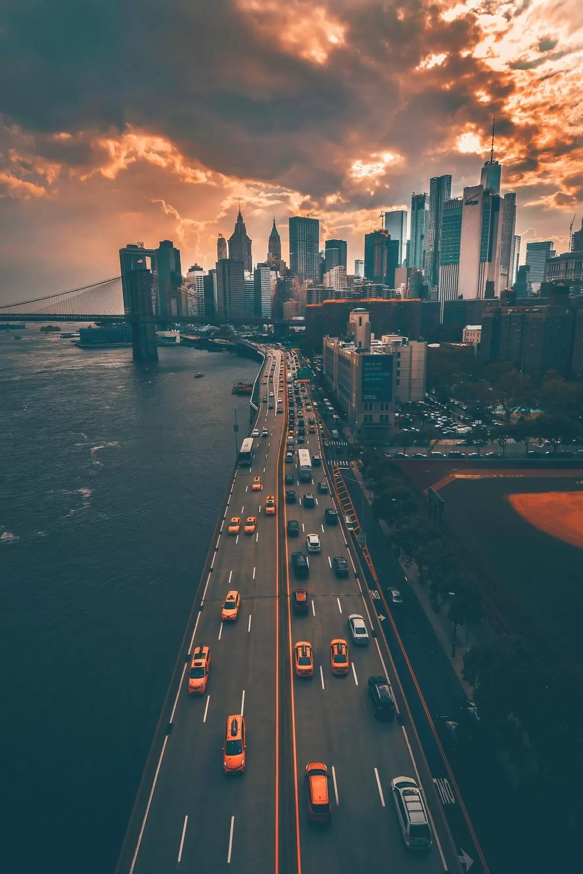 Plakatas Tiltas per vandenį su automobiliais ir pastatais fone f37482