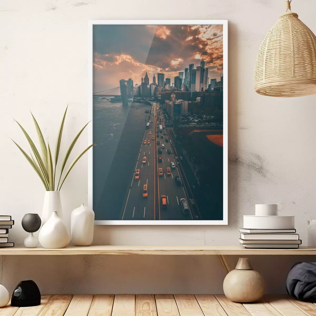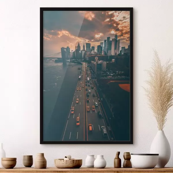 Plakatas Tiltas per vandenį su automobiliais ir pastatais fone Ne f37482
