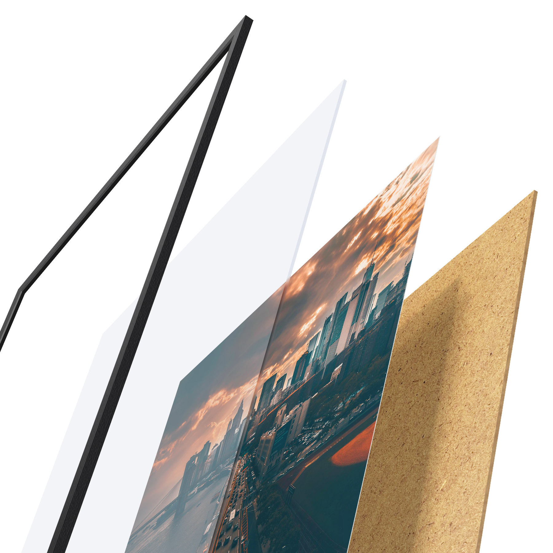 Plakatą sudaro rėmas, pleksiklas, atspausdintas vaizdas ir medžio drožlių plokštės pagrindas. Plakatą galima iš karto pakabinti ant sienos dėl kitoje pusėje esančių laikiklių.