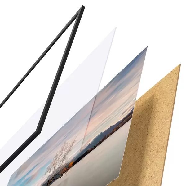 Plakatą sudaro rėmas, pleksiklas, atspausdintas vaizdas ir medžio drožlių plokštės pagrindas. Plakatą galima iš karto pakabinti ant sienos dėl kitoje pusėje esančių laikiklių.