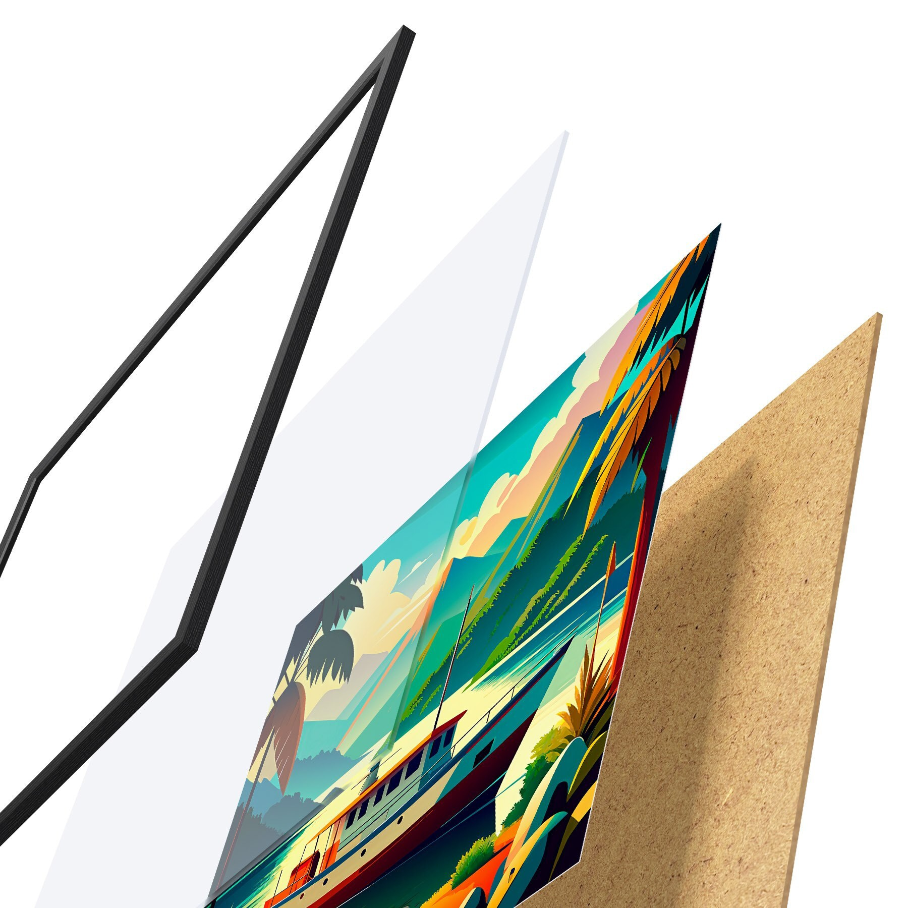 Plakatą sudaro rėmas, pleksiklas, atspausdintas vaizdas ir medžio drožlių plokštės pagrindas. Plakatą galima iš karto pakabinti ant sienos dėl kitoje pusėje esančių laikiklių.