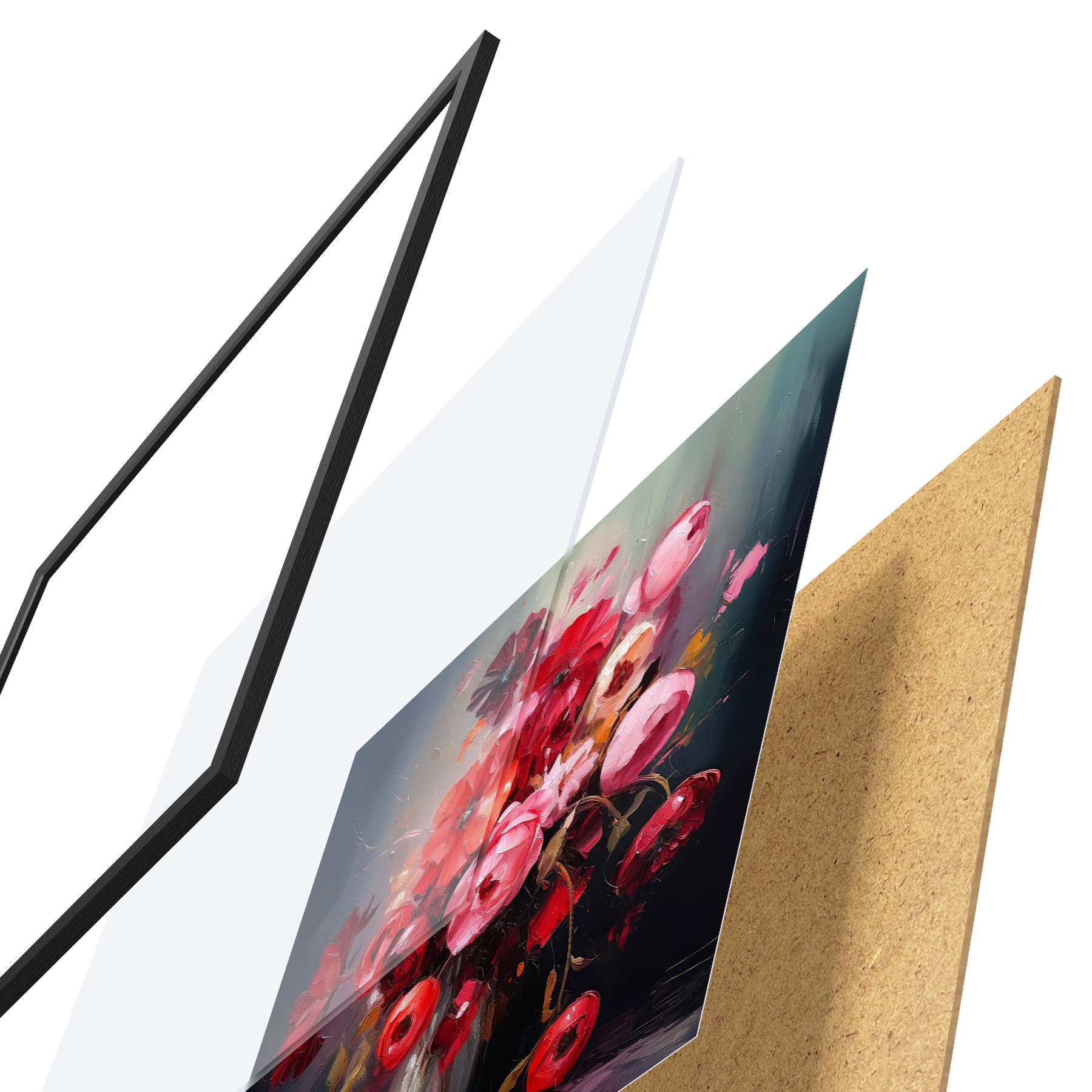 Plakatą sudaro rėmas, pleksiklas, atspausdintas vaizdas ir medžio drožlių plokštės pagrindas. Plakatą galima iš karto pakabinti ant sienos dėl kitoje pusėje esančių laikiklių.